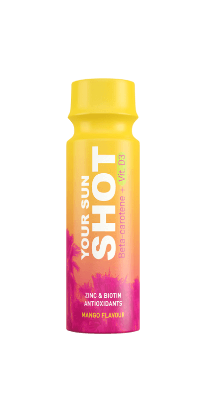 Všestranný nápoj Your Sun Shot s příchutí MANGO pro ještě dokonalejší bronzovou barvu pleti, kterou získáte během opalování v soláriu nebo na slunci. Účinná složka Beta Karoten podporuje hluboké a přirozeně vypadající opálení. Kombinace vitamínů (D, E) a Biotin poskytují zvýšenou pružnost a odolnost pokožky. Minerální látky selen a zinek patří mezi nejsilnější přírodní antioxidanty, jejichž zvýšeným příjmem eliminujeme negativní vliv životního prostředí na pleť.